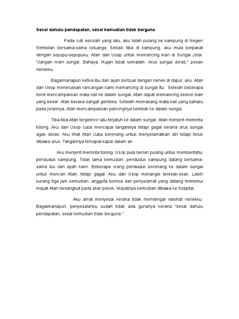 Bryan Bornschein on Contoh karangan spm peribahasa sesal dahulu pendapatan sesal kemudian tidak berguna. NIBONG TEBAL 9 Mac 2016 Sesal dahulu pendapatan sesal kemudian tidak berguna satu peribahasa yang membawa maksud sebelum melakukan sesuatu perkara hendaklah difikirkan dahulu baik dan buruk agar tidak berlakunya penyesalan di hari kelak. Sesal Kemudian Tidak Berguna Add to my workbooks 6 Download file pdf.